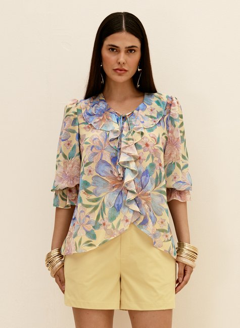 Encontre na Dimy a Blusa Feminina Estampada com Babados, feita 100% em poliéster tecido plano. Com design moderno e elegante, esta peça se destaca em qualquer look. Perfeita para combinar com saias, calças e shorts. Garanta a sua agora e arrase no visual!