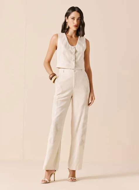 A calça feminina Dimy é confeccionada com 74% viscose, 17% linho e 9% algodão, proporcionando conforto e qualidade. Possui detalhes bordados que agregam sofisticação ao visual. Ideal para compor looks elegantes e modernos. Compre já a sua!