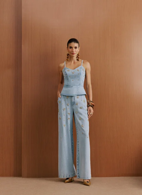 Aproveite o conforto e elegância da calça feminina 100% algodão da DIMY com acabamento em alfaiataria e bordado de strass. Feita de algodão jeans de alta qualidade, essa peça é perfeita para diversas ocasiões. Garanta a sua agora e tenha um look sofisticado e cheio de estilo.