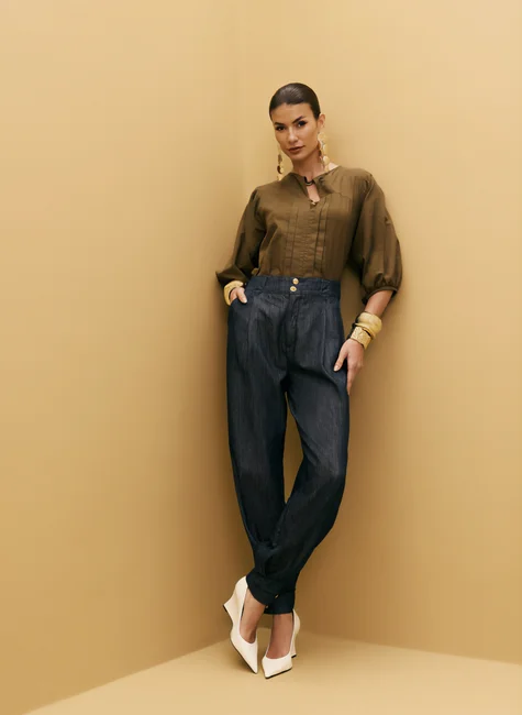 A Calça Feminina Diferenciada com Pregas da Dimy é confeccionada em 100% algodão jeans, garantindo conforto e durabilidade. Com design moderno e detalhes únicos, é a peça ideal para compor um look cheio de estilo. Adquira já a sua e arrase!