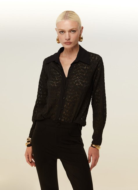 Camisa feminina Dimy em malha crochê, confeccionada em 97% poliéster e 3% elastano. Peça moderna e versátil, ideal para compor looks estilosos e confortáveis. Aproveite a qualidade do tecido plano e garanta já a sua!