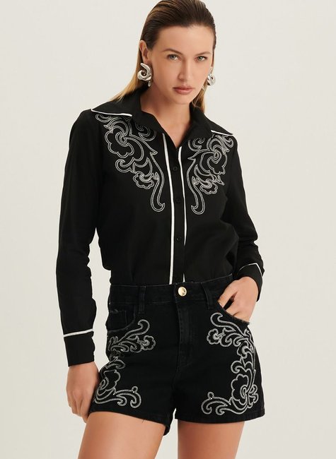 Experimente o estilo western com o Shorts Feminino Madonna Black Dimy. Feito com 100% algodão jeans, possui bordados e detalhes únicos que garantem um visual moderno e despojado. Ideal para compor looks cheios de personalidade. Encontre o seu na Dimy!