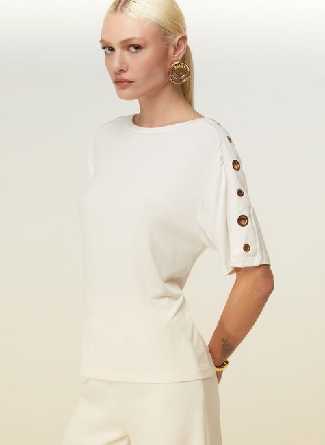 Incremente seu guarda-roupa com a T-Shirt feminina da Dimy. Feita em 98% viscose e 2% elastano, a peça conta com recorte e ilhós na manga, trazendo um toque de modernidade ao seu visual. Versátil e confortável, é ideal para compor looks casuais cheios de estilo. Aproveite!