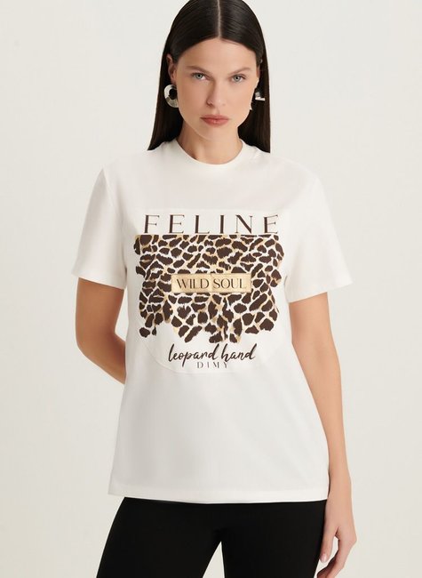 Garanta estilo e conforto com a T-shirt feminina Dimy. Feita em 100% algodão, essa peça é perfeita para o dia a dia. Seu design moderno conta com estampa exclusiva, garantindo um visual autêntico e cheio de personalidade. Compre já a sua!