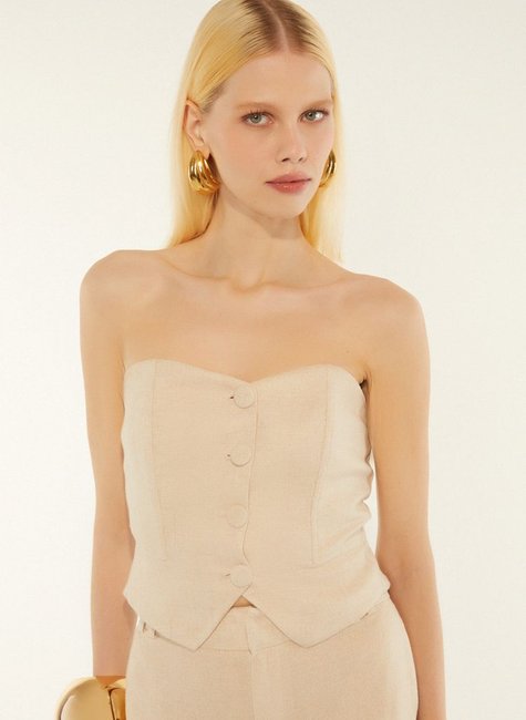 O Top Sem Alça Com Abotoamento Feminino da Dimy é feito com 75% de viscose e 25% de linho, proporcionando conforto e leveza. Ideal para compor looks cheios de estilo e personalidade. Encontre o seu na Dimy e arrase!