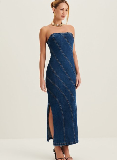 O Vestido Feminino Midi Sem Alças Dimy é perfeito para quem busca conforto e estilo. Confeccionado em 98% algodão e 2% elastano, possui um caimento incrível e tecido jeans de alta qualidade. Ideal para compor looks versáteis e cheios de personalidade. Adquira já o seu!